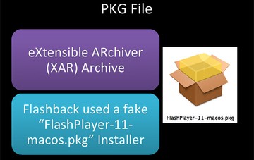 PKG files – a lot of these files are going into one called logKext. Has anybody used logKext before? It makes a really great presentation example. You can download it off of Google Code, it’s an open-source keylogger. It runs on Mac wonderful. It makes a really good example. So, a PKG file is eXtensible ARchive, XAR, if you are really interested in it. It’s one of the more obscure archive formats. Flashback used a PKG file actually called “FlashPlayer-11-macos.pkg”, I’m showing the screenshot there. This is supposed to, obviously, look like a Flash Player update that gets the user to click it. It actually asked for credentials, the user puts in the credentials – and they are so owned. Flashback came out a couple of years ago, and this was national news. 600,000 systems were infected, which is nothing compared to Windows malware, nothing. But for Mac malware – holy crap! It was a game changer.